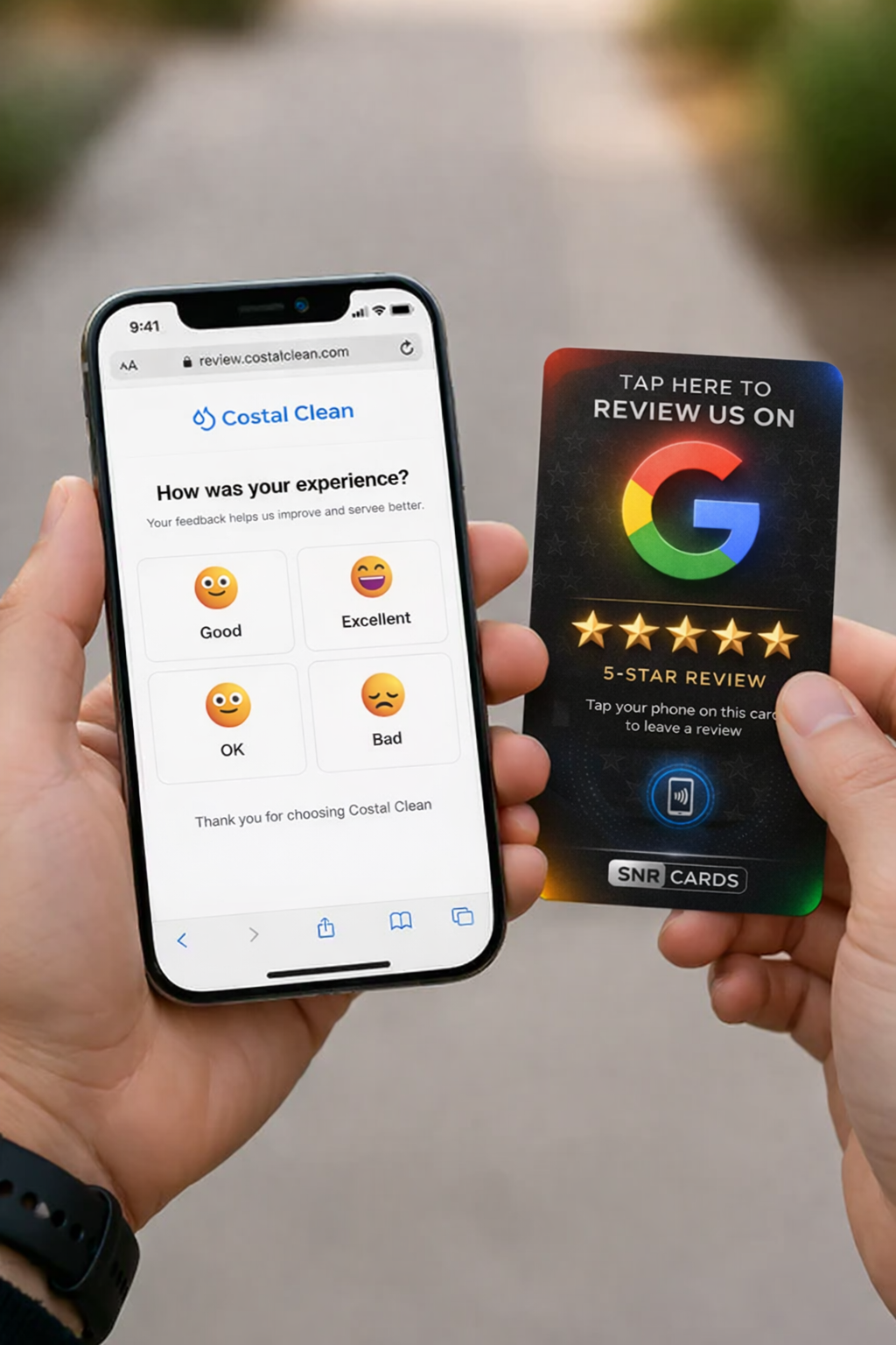 The SNR CARD app is the page customers open after tapping the card or scanning the QR code. It guides them through a quick review experience and directs satisfied customers to leave a Google review.