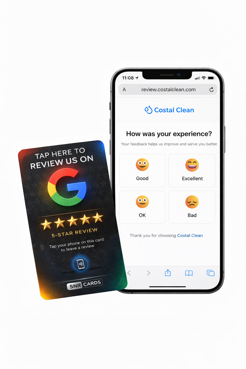 After tapping the card, customers answer a quick question about their experience. Satisfied customers are directed to leave a public Google review, while less satisfied customers can submit private feedback.